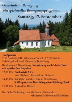 | 10:45 | Gottesdienst: musikalische Mitgestaltung: Chor Insieme, anschließend Pfarrfest im Innenhof der Kirche mit den Taktlosen aus Durach und den Feierabend-Musikanten aus Sulzberg |