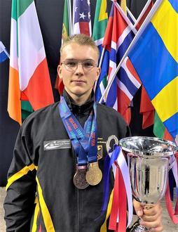 Weltmeister Mika Mathes bei der Siegerehrung mit seinen Medaillien und dem Siegerpokal