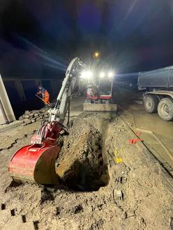 Das Glück: Unsere Freiwillige Feuerwehr war auch schon vor Ort, sie hatten gerade eine 24 Stunden-Übung mit der Jugendfeuerwehr und konnten den Bauhof gleich mit Licht an der Schadensstelle unterstützen. Nach kurzer Besprechung wurde eine Duracher Baggerfirma angerufen. Der Jungunternehmer war wegen der Jugendübung auch am Feuerwehrhaus. Sein Bagger stand, durch Zufall, auf einer Baustelle im Dorf in der Nähe des Rohrleitungsschadens. Nach kurzer Absprache begannen er und die Männer des Betriebshofs ab ca. 22 Uhr 30 ein Loch zu graben, um das Leck zu finden. Man machte eine Punktlandung und fand die Leitung in 1,7 Meter Tiefe direkt unter Strom- und Telefonleitung. Zum Glück bevorratet der Wassermeister eine Vielzahl von Ersatzteilen und hatte das passende Reparaturstück für diese Leitung auf Lager. Die Wasserleitung konnte dann am Sonntag um 2 Uhr früh wieder in Betrieb genommen werden. Kaum ein Bürger war betroffen.