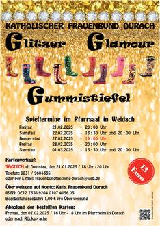 Durach - Unter dem schillernden Motto „Glitzer und Glamour Gummistiefel“ lädt der Frauenbund Durach herzlich zum diesjährigen Fasching im Pfarrsaal in Weidach ein. Freuen Sie sich auf eine bunte Mischung aus funkelnder Eleganz und rustikalem Charme, die das Publikum begeistern wird.