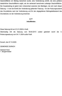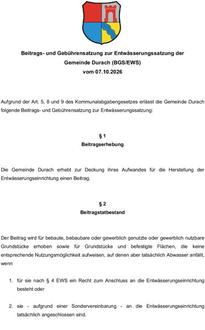 In seiner Sitzung vom 06.10.2025 hat der Gemeinderat der Gemeinde Durach die Satzung für die Beitrags- und Gebührensatzung zur Entwässerungssatzung der (BGS/EWS) neu beschlossen.