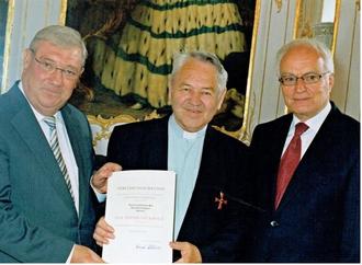 Auszeichnung mit dem Bundesverdienstkreuz. v.li. Staatsminister a.D. Josef Müller, Msgr. Hochenauer, Reg. Präsident Ludwig Schmid