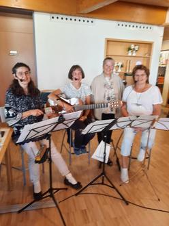 Mit Gesang und Gitarrenbegleitung erfreuten „Die drei Cousinen“ aus Memhölz mit ihren herrlichen Stimmen die Gäste und dazu gab es das gewohnte Frühstücksbüffet und guten Zwetschgendatschi. Die Moderation lag in den bewährten Händen von Gretel Welz-Winkler, die mit Charme und Perfektion durchs Programm führte. Die Sängerinnen und die Moderatorin sehen Sie auf nebenstehendem Foto.
