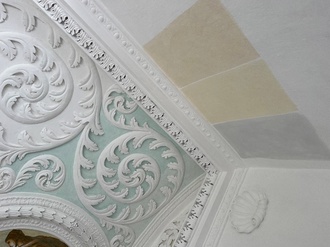 Nach der Freilegung der Decke von falscher Farbe, der Reinigung, der Schadensbehebung an Decke und Wänden (Risse und Bruchstellen), der Sanierung und Neubemalung der Stuckarbeiten an der Decke und um die Fenster herum, war von Vertretern des Denkmalamtes im Zusammenwirken mit dem Restaurator Gerhard Eyerschmalz und den Verantwortlichen vor Ort die Farbgebung der Stuckunterdecke und der Seitenwände zu klären. Insgesamt sind über die Jahre und an den Wänden verteilt drei Farben aus alten Zeiten erkennbar gewesen. Entschieden hat man sich für die Farben Malachitgrün an der Stuckdecke und Siena an den Wänden (Farben im Stuck und unten rechts).