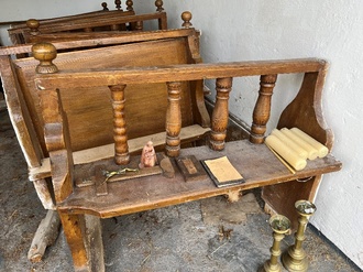 Beim gleichen Termin hat sich die Gruppe nochmals intensiv mit den Kirchenbänken beschäftigt. Nach Feststellung der Denkmalschutzvertreter stammen diese aus der Barockzeit, sind also wesentlich älter als angenommen. Dies ist erkennbar an den Ornamentbemalungen an den Wangen sowie an den höchst seltenen gedrechselten Rückenteilen der Bänke, verziert mit eingeschnitzten Kanneluren. Der Schreiner hat seinerzeit römische Säulen nachgebildet. Eine Säule ist anders gestaltet, vermutlich war dies der Platz der Kapellenspenderin in der ersten Reihe. Es ist ein „Muss“, diese Bänke zu sanieren und wieder einzubauen. Ganz spontan haben die Denkmalamtsvertreter aus München und Sonthofen eine zusätzliche Bezuschussung in Aussicht gestellt.