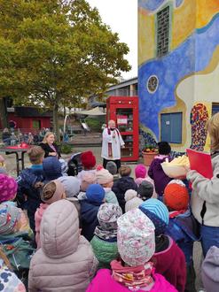 Unser Hundertwasserturm vor dem Kinderhaus St. Josef hat einen neuen Freund. Eine Telefonzelle als Kinderbücherei. Gerne können hier Kinder Bücher bis zur 2. Klasse hineinstellen.