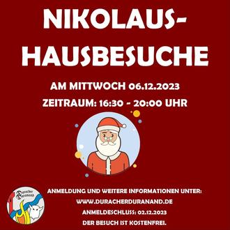 Anmeldeschluss: 02.12.2023 – Wir haben leider nur eine begrenzte Anzahl an Besuchen zu vergeben. Die Anmeldungen werden nach Zeitpunkt des Eingangs berücksichtigt. Nach Anmeldeschluss kontaktieren wir Sie, zu welchem Zeitpunkt der Nikolaus zu Ihnen ins Haus kommt.