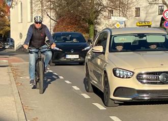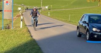 Ein gestrichelter Sicherheitsstreifen wie hier am Beispiel in Lenzfried, wäre entlang der Füssener Straße von der Total-Tankstelle bis zum Mühlenplatz eine einfache Möglichkeit die Sicherheit von Radfahren und Autofahren zu erleichtern.