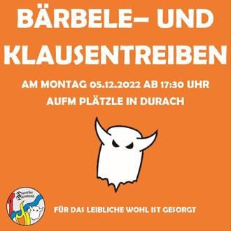 Am Montag den 05.12.2022 findet das Bärbele- und Klausentreiben auf dem Plätzle statt. Beginn der Veranstaltung ist um 17:30 Uhr. Für das leibliche Wohl ist gesorgt.