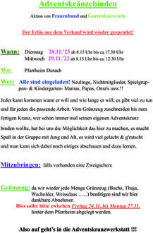 Am Donnerstag, den 30. November richten wir ab 18.00 Uhr im Pfarrheim her. Dazu können wir jede helfende Hand brauchen. Also, wer Zeit und Lust hat uns zu helfen, soll einfach vorbeikommen.