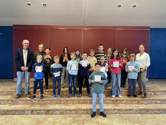 Von links: Lukas Ackermann (2. Sieger 2.Kl), Valentin Gudermann (1. Sieger 2.Kl), Michael Götzeler (2. Sieger 3.Kl), Manuel Eltrich (2. Sieger 3.Kl), Nina Hägele (1. Siegerin 3.Kl), Sophia Haslach (3. Siegerin 4.Kl), Noah Yagci (2. Sieger 4.Kl), Mateo Hailer (Schulsieger)