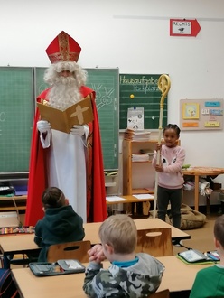 Wir hatten Glück und der Nikolaus schaute am 5. Dezember in allen ersten Klassen vorbei. Voller Freude und Aufregung erwarteten die Kinder schon den Heiligen Sankt Nikolaus und begrüßten ihn mit einstudierten Liedern oder Gedichten. Er lobte die Schulanfänger für ihren Fleiß und wie toll sie schon lesen und schreiben können. Ein paar mahnende Worte fand er für die Unruhe im Gang und an der Garderobe. Alles in allem strahlten dem Nikolaus jedoch viele glückliche Augen entgegen, als er seinen großen Sack auspackte und für jedes Kind ein Päckchen dabeihatte.