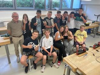 Fasziniert von den ersten Erfahrungen, wie schnell aus einem Rundholz etwas Formschönes entstehen kann, begannen die Jugendlichen mit vollem Eifer und Konzentration einen Salz- und Pfefferstreuer sowie einen Kerzenständer zu drechseln. Als Highlight des Vormittags drechselten die Schülerinnen und Schüler einen Kugelschreiber aus verschiedenen Holzarten. Hier war besonderes Feingefühl gefragt. Voller Begeisterung arbeiteten alle Schüler an den mobilen Drechselbänken und präsentierten am Ende ihre Werkstücke voller Stolz.