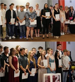 Im Anschluss konnten die beiden Klassenlehrer, Kathrin Knaus (9a) und Thomas Schütz (9b) die Abschlusszeugnisse an ihre Abschlussschüler ausgeben. Auch die Schüler kamen zu Wort, indem sie einen kurzen Rückblick auf ihre Schulzeit gewährten und sich bei ihren Lehrkräften bedankten.