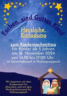 | 14.30 – 17.00 | Kindernachmittag in Hafenpreppach für Kinder ab 5 Jahren, Thema: Farben sind das Kleid Gottes - Gelb – mit Beginn des Krippenspiels für Altenstein und des Weihnachtsmusicals für Hafenpreppach |