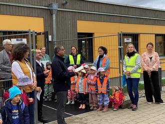 Nun wurde heute der Segen Gottes für das neue Zuhause unserer kleinen und großen Igel erbeten. Dazu kamen nicht nur die Igelkinder selbst, sondern auch alle anderen Kita-Gruppen zu der kleinen Feierstunde. Als Gäste waren Herr Pfarrer Ries, unser Pater Lijoy, Bürgermeister Storath und die Architektin Frau Messmer anwesend. Herr Pfarrer Ries wünschte den Igeln alles Gute für ihre Zeit im Igelhaus und Pater Lijoy segnete das neue Gebäude mit Gebeten und Weihwasser. Alle anwesenden Kinder sangen dazu mit Gitarrenbegleitung das Lied „Gott baut ein Haus das lebt“ und “Gott, dein guter Segen ist wie ein großes Zelt“. Und weil ein Fest erst dann ein richtiges Fest ist, wenn es etwas Feines zu essen gibt, spendierte die Gemeinde zur Feier des Tages eine Brotzeit für alle Kinder.