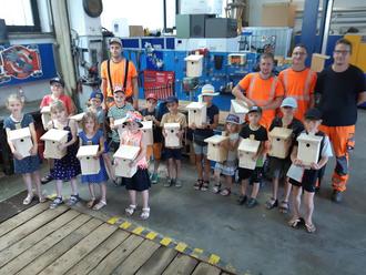 Zunächst wurde den Kindern der fertige Nistkasten gezeigt und jedem Kind die dafür benötigten Einzelteile zugeteilt. Anschließend wurden die einzelnen Stationen, wie Schleifen, Bohren und Schrauben, vorgeführt und erklärt. Dann ging es los: erst mussten die Sägekanten der Bretter mit einem Schleifpapier abgeschliffen werden. Wer damit fertig war, konnte an den kleinen Ständerbohrmaschinen die Löcher für die Befestigungsschrauben eigenständig vorbohren – hierfür wurden extra Lehren angefertigt. Dabei stand immer ein Bauhofmitarbeiter unterstützend zur Seite. Dann ging es an den Montagewerkbänken mit dem Zusammenbau weiter. Hier zeigte sich das handwerkliche Geschick der Kinder – einige konnten schon mit einer Hand den Akkuschrauber bedienen und die Schrauben versenken. Nach der Fertigstellung wurde den Kindern ihr eigens gefertigter Nistkasten sowie eine Beschreibung für das richtige Anbringen für zu Hause übergeben. Nebenbei beantworteten die Bauhofmitarbeiter gerne noch die von den Kindern gestellten Fragen was u.a. mit der Hebebühne gemacht wird oder für was der große Bauhof-LKW gebraucht wird. Alle Kinder zeigten sich begeistert und voller Engagement. Zum Schluss bekamen alle noch ein Eis als Belohnung und der gelungene Nachmittag fand sein Ende.