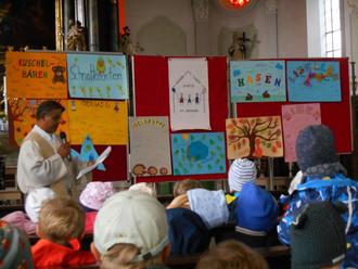 Alle 11 Gruppen der Kita St. Michael trafen sich dazu in der Kirche und gemeinsam mit Pater Lijoy sangen und beteten wir.