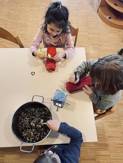Die Mäusekinder (3-6 Jahre) des Kindergarten St. Martin in Döringstadt beobachten interessiert das Vogelhäuschen im Garten. Welche Vögel sind im Winter bei uns, welche fliegen in den Süden? Was fressen die heimischen Vögel gerne? Wie klingt das Gezwitscher von Spatz, Meise, Amsel und Rotkehlchen? Wie kann man diese Vögel voneinander unterscheiden? Mit Liedern, Fingerspielen und Gesprächen klären wir all diese Fragen. Um das ganze zu vertiefen Bemalen und Bekleben die Kinder einen leeren Tetrapack, schneiden vogelgroße Löcher hinein und stecken kleine Äste unter die Löcher. Darauf können sich die Vögel zum Essen setzen. Zum Schluss mischen wir selbt ein Vogelfutter aus Nüssen, Beeren, Haferflocken, Sonnenblumenkernen und Öl (Naschen erlaubt!) und füllen unsere selbstgebastelten Vogelhäuser damit. Jetzt fehlt nur noch ein Platz im eigenen Garten dafür. Weil den Kindern das Vogelfutter beim Naschen so gut geschmeckt hat, essen wir es als gemeinsames Frühstück mit Müsli, Milch und Joghurt.