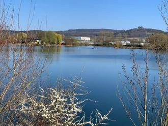 Blick über den Badesee zum Ansberg (Veitsberg).