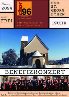Herzliche Einladung zum Konzert am Sonntag, 25. Februar 2024 um 19.00 Uhr in der Kirche St. Georg in Böhen. Der „Chor96“ aus Ottobeuren und das junge Münchner Männerensemble „133 Hertz“ singen für einen guten Zweck. Als Zuhörer dürfen Sie sich auf eine große musikalische Bandbreite freuen, die Ottobeurer singen Werke von der Renaissance bis zur Romantik, während die Münchner Sänger ihren Schwerpunkt auf die Moderne gelegt haben.
