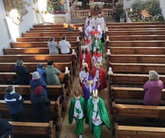 Anfang des Jahres waren die Sternsinger in der Pfarrgemeinde unterwegs. Sie erinnerten mit ihren Kronen und den königlichen Gewändern an die Heiligen drei Könige, die zum Jesuskind in der Krippe kamen. Sie brachten den Segen C + M + B – Christus segne dieses Haus – in alle Häuser und Wohnungen.