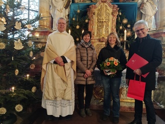 Kirchenverwaltung Regina Vorraber (2.von rechts) und Ludwig Schedel (ganz rechts) von Pater Winfried verabschiedet.