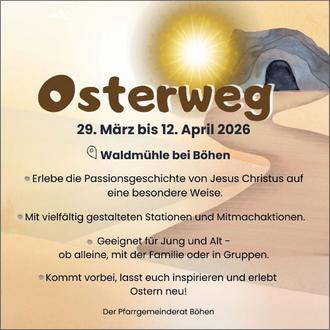 Wir möchten Euch alle einladen, in der Osterzeit die Passionsgeschichte auf besondere Weise zu erleben. Wir haben einen Osterweg mit verschiedenen Stationen vom Einzug Jesu in Jerusalem über seinen Leidensweg bis zu seiner Auferstehung aufgebaut.