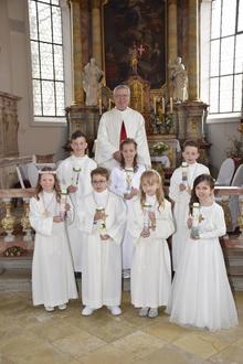 Am 27. April haben diese 7 Kinder (hinten v. links Felix Beurer, Lucia Sauter, Lukas Fickler, vorne v. links Paula Zettler, Elias Sepp, Lorena Müller, Sophia-Marie Hilpold) bei traumhaftem Wetter zusammen mit ihren Familien in unserer Pfarrkirche St. Georg ihre Erstkommunion gefeiert.
