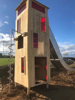 Am 06. und 07.11.23 war es soweit-nachdem das Wetter uns hold war und der Regen nur sporadisch fiel, konnten wir nicht nur die Sitzgruppe und Kleinkinderspielanlage errichten, sondern auch unser „Wahrzeichen“, den Feuerwehrturm mit der Freifallrutsche stellen. An dieser Stelle ein herzlicher Dank an Uwe und seine Mannen von der „Rustikalen Holzgestaltung“ für die Umsetzung, der von uns entworfenen und geplanten Spielgeräte.