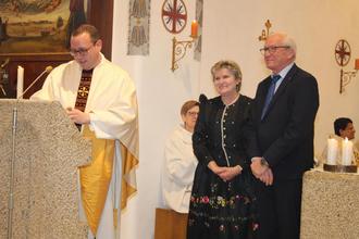 Nach diesen Worten trat Pfarrer Tobias Fehn ans Mikrofon und sprach, auch im Namen des leitenden Pfarrers Joachim Cibura ein riesengroßes Dankeschön an unseren Kirchenpfleger Thomas Zwiener und unserer Mesnerin Inge Zwiener aus. Ohne das Engagement dieser beiden, wäre die Punktlandung der Fertigstellung der Renovierungsarbeiten, nicht möglich gewesen! In den Monaten der Renovierung sorgten die beiden beispielsweise dafür, dass Sonntag für Sonntag der Ort für den Gottesdienst hergerichtet wurde, d.h. die Bestuhlung des Pfarrgartens oder der Aula – und nach dem Gottesdienst kümmerten sie sich darum, dass alles wieder aufgeräumt wurde. Es verging kaum ein Tag, an dem Thomas Zwiener nicht auf der Baustelle war und nach dem Rechten geschaut hat. Inge Zwiener kümmerte sich während der Arbeiten um das leibliche Wohl der ausführenden Firmen und versorgte diese täglich mit Kaffee, Kuchen und Essen. Wurden kurzfristig Helfer zum Mitanpacken gebraucht, so scheuten sie keine Mühe ebendiese aufzutreiben.