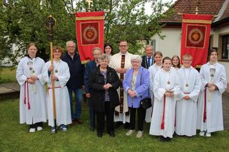 Unter den Klängen der Blaskapelle Poxdorf zogen die Jubilare mit Pfarrvikar Tobias Fehn und den Ministranten in unsere festlich geschmückte Kirche. Dort feierten wir gemeinsam den Festgottesdienst. Nach dem feierlichen Auszug der strahlenden Jubilare gab es während des Stehempfangs im Pfarrgarten die Möglichkeit des Austausches und Wieder-Erkennens für alle Anwesenden. Pfarrer Tobias Fehn begrüßte und beglückwünschte jeden der Jubilare.