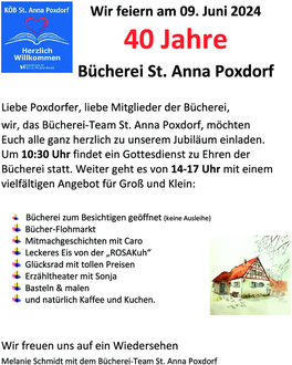 wir, das Bücherei-Team St. Anna Poxdorf, möchten Euch alle ganz herzlich zu unserem Jubiläum einladen.