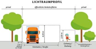 Überhängende Äste von Bäumen und Sträuchern beeinträchtigen die Nutzung von Gehwegen und Straßen! Jeder Grundstückseigentümer ist verpflichtet seinen Überhang an Gehwegen ab Grundstücksgrenze bis zu einer Höhe von 2,50 m und bei Fahrbahnen bis zu einer Höhe von 4,50 m ab Grundstücksgrenze zu entfernen (Lichtraumprofil). Dies ist ganzjährig einzuhalten. Bitte warten Sie nicht auf eine persönliche Aufforderung durch das Ordnungsamt sondern kontrollieren Sie selbst die Einhaltung und denken Sie an ihre Mitbürgerinnen und Mitbürger, denn allen steht die uneingeschränkte Nutzung des öffentlichen Grunds zu.