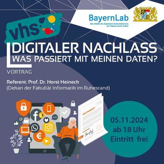 Dieser Vortrag richtet sich an alle, die über Online-Accounts verfügen und dafür Regelungen treffen wollen - unabhängig vom Alter. Der Vortrag findet vor Ort im BayernLab Forchheim in der Dechant-Reuder-Straße 8 statt. Die Teilnahme ist kostenlos, eine Anmeldung ist unbedingt erforderlich! Sichern Sie sich am besten gleich Ihren Platz über die Homepage der vhs Forchheim - Digitaler Nachlass (Kursnummer FO160).