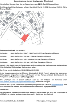 Der Antrag kann in der Zeit vom 09.02.2026 bis 08.03.2026 in der Verwaltungsgemeinschaft Effeltrich, Schulstraße 6, 91099 Poxdorf, während der allgemeinen Öffnungszeiten eingesehen werden. Auf Wunsch wird die Planung erläutert. Gleichzeitig ist die Gelegenheit zur Äußerung und Erörterung gegeben.