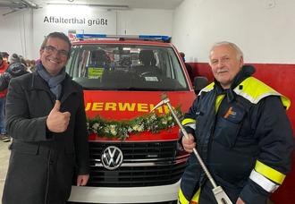 Bürgermeister Stefan Förtsch und Kommandant Siegfried Dietel bei der Übergabe des neuen Mannschaftstransportwagens mit dem taktischen Rufnamen „Florian Affalterthal 14/1“.