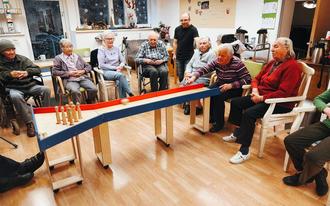 Es ist wirklich eine besondere Kegelbahn: auf Sitzhöhe können die Spieler_innen gegeneinander antreten! Die Diakonie-Tagespflege Mostviel in Egloffstein ist stolze Besitzerin einer solchen Bahn. Und natürlich wird sie auch regelmäßig aktiviert, wie vor Kurzem bei einem launigen Spieletag. Die Tagespflege-Gäste waren hochkonzentriert bei der Sache - und Spaß gemacht hat's auch allen!