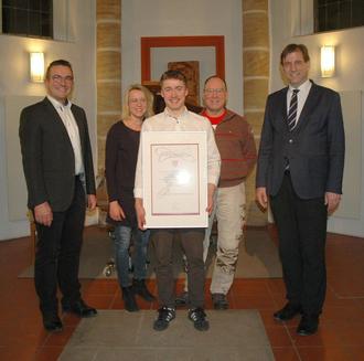 Der frisch gekürte Felix Milke mit seinen Eltern, Landrat Dr. Hermann Ulm und Bürgermeister sowie Kreisrat Stefan Förtsch.