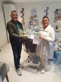 Tanja Gölz erhielt von Heinz Fischer (WVÜ) eine Urkunde und ein Präsent zum Gewinn der Weihnachtschaufenster Aktion 2024 überreicht.