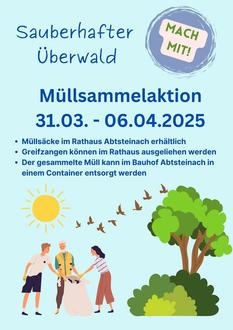 In der Zeit vom 31. März (Montag) bis 06. April (Sonntag) 2025 lautet der Aufruf an Privatpersonen, Vereine, Schulen und Initiativen, Müll im Überwald zu sammeln. Sofern benötigt, können bei den Ausgabestellen der Rathäuser in Abtsteinach, Hammelbach und Wald-Michelbach sowie der Kurverwaltung Gras-Ellenbach und der Zukunftsoffensive Überwald stabile Müllsäcke abgeholt werden. Der gesammelte Müll kann in der Aktionswoche in von den Gemeinden bereitgestellten Containern/Anhängern am Bauhof Abtsteinach, Bauhof Wald-Michelbach und dem Parkplatz der Nibelungenhalle in Gras-Ellenbach abgegeben werden.