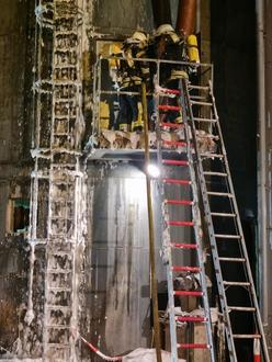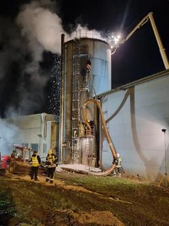 Am 18.02.2024 gegen 02:15 Uhr wurde die Feuerwehr Abtsteinach durch den Kreis Bergstraße nach Birkenau alarmiert. Dort brannte seit dem 16.02.2024 ein Silo, welches mit Hackschnitzel gefüllt war. Bei diesem Einsatz sind insgesamt 14 Feuerwehren und ca. 300 Einsatzkräfte zum Einsatz gekommen. Die Feuerwehr Abtsteinach war mit 10 Einsatzkräften vor Ort und löste die eingesetzten Einsatzkräfte bei den Löscharbeiten am Silo ab. Während ein Trupp von uns bei Löscharbeiten vom Teleskopgelenkmast TGM 23/12 der Feuerwehr Lorsch eingesetzt wurde, übernahm ein anderer Trupp das Absaugen von Hackschnitzeln mittels Saugwagen an einer Seitenöffnung des Silos.