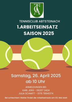 Der 1. Arbeitseinsatz des Tennisclub Abtsteinach findet am Samstag, dem 26. April, ab 10 Uhr, auf der Tennisanlage des Vereins statt.