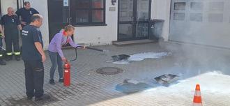 Besonders spannend war für die Teilnehmerinnen die praktische Übung: Verschiedene Feuerlöscher wurden ausprobiert, sodass die Mitarbeiterinnen die Handhabung in der Praxis erlernen konnten. Diese praktische Erfahrung soll dazu beitragen im Ernstfall ruhig und sicher zu reagieren.
