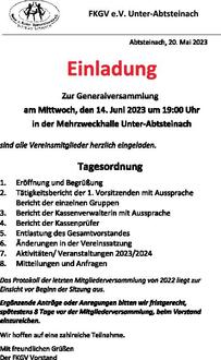 Der Vorstand des Frauen- und Kinder-Gymnastikvereins Unter-Abtsteinach lädt am Mittwoch, 14. Juni, um 19 Uhr in die Mehrzweckhalle in Unter-Abtsteinach alle Mitglieder zur jährlichen Generalversammlung ein. Neben den Tätigkeitsberichten des Vorstandes, der Sportgruppen sowie der Kassenbericht steht eine Änderung der Satzung auf der Tagesordnung. Der Vorstand bittet um eine zahlreiche Teilnahme.