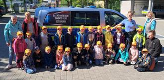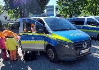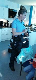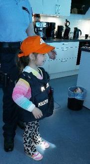 Hautnah durften die Kinder den Schutzhelm aufsetzen und auch die schwere Schutzweste anziehen. Frau Marx veranschaulichte den Kindern was ein Polizist so alles macht und welche Hilfsmittel dazu gebraucht werden. So zum Beispiel Handschellen und Funkgeräte. Selbst die Dienstmarke durfte jedes Kind in der Hand unter die Lupe nehmen. Die Kinder erfuhren auch, welche Aufgaben die Polizei im Alltag übernimmt und wie wichtig deren Arbeit für die Sicherheit der Bürger ist. Besonders spannend waren die Besichtigung und die Begehung der Arrestzellen.