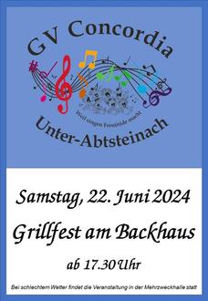 Der GV "Concordia" Unter-Abtsteinach veranstaltet am Samstag, 22. Juni 2024 ein Grillfest auf dem Backhausgelände. Angeboten werden verschiedene (auch fleischlose) Grillspezialitäten. Aufgelockert wird das Fest durch ein musikalisches Programm (Details folgen). Einladung ergeht an alle, los geht es es um 17.30 Uhr. Bei schlechtem Wetter wird die Veranstaltung in die Mehrzweckhalle verlegt.