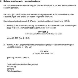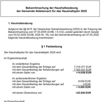 Bei der Veröffentlichung der Haushaltssatzung der Gemeinde Abtsteinach ist uns leider ein kleiner Fehler unterlaufen – da hat sich das falsche Dokument auf den Weg gemacht. Wir bitten das Versehen zu entschuldigen und reichen natürlich die richtige Fassung hiermit nach.