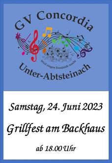 Der GV „Concordia“ veranstaltet am Samstag, 24. Juni ein Grillfest auf dem Backhausgelände. Angeboten werden verschiedene (auch fleischlose) Grillspezialitäten. Einladung ergeht an alle, los geht es es um 18.00 Uhr. Geplant ist außerdem ein Auftritt des Chores. Bei schlechtem Wetter wird die Veranstaltung in die Mehrzweckhalle verlegt.