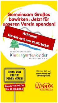 Liebe Abtsteinacher Mitbürginnen und Mitbürger. In der letzte Ausgabe des Hardbergboten informierten wir, der Förderverein der Kindergartenkinder Abtsteinach e.V. Sie darüber, dass vom 3.06. bis 28.09.2024 in den Netto-Filialen Abtsteinach sowie Wahlen das Leergutpfand sowie das Aufrunden an der Kasse zu Gunsten des Fördervereins geht. In dieser Woche erreichte uns die Nachricht, dass Netto die Spendenphase ab dem 12.06.2024 für 4 Wochen aussetzt, um den Flutbetroffenen der jüngsten Überschwemmungen in Bayern, Baden-Württemberg und Umland zu helfen. Selbstverständlich brauchen nun zahlreiche Menschen, die ihr Hab und Gut durch das Hochwasser verloren haben, Unterstützung. Dafür haben wir größtes Verständnis und zeigen gerne unsere Solidarität mit den Betroffenen. Nichts desto trotz entfällt die Aktion „Bring dich ein für deinen Verein“ nicht, sondern startet erneut am 15.07. und endet am 02.11.2024. Der Verdopplungstag, bei dem Netto die eingegangnen Spenden verdoppelt, wird vom 22.06. auf den 21.09.2024 verschoben. Wann sich der Förderverein an der Nettofiliale vorstellt, ist noch unklar. Vielen Dank für Ihr Verständnis. Ihr Förderverein der Kindergartenkinder Abtsteinach e.V.